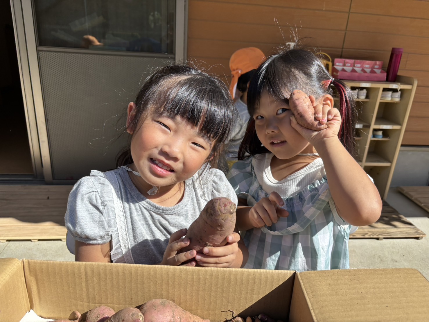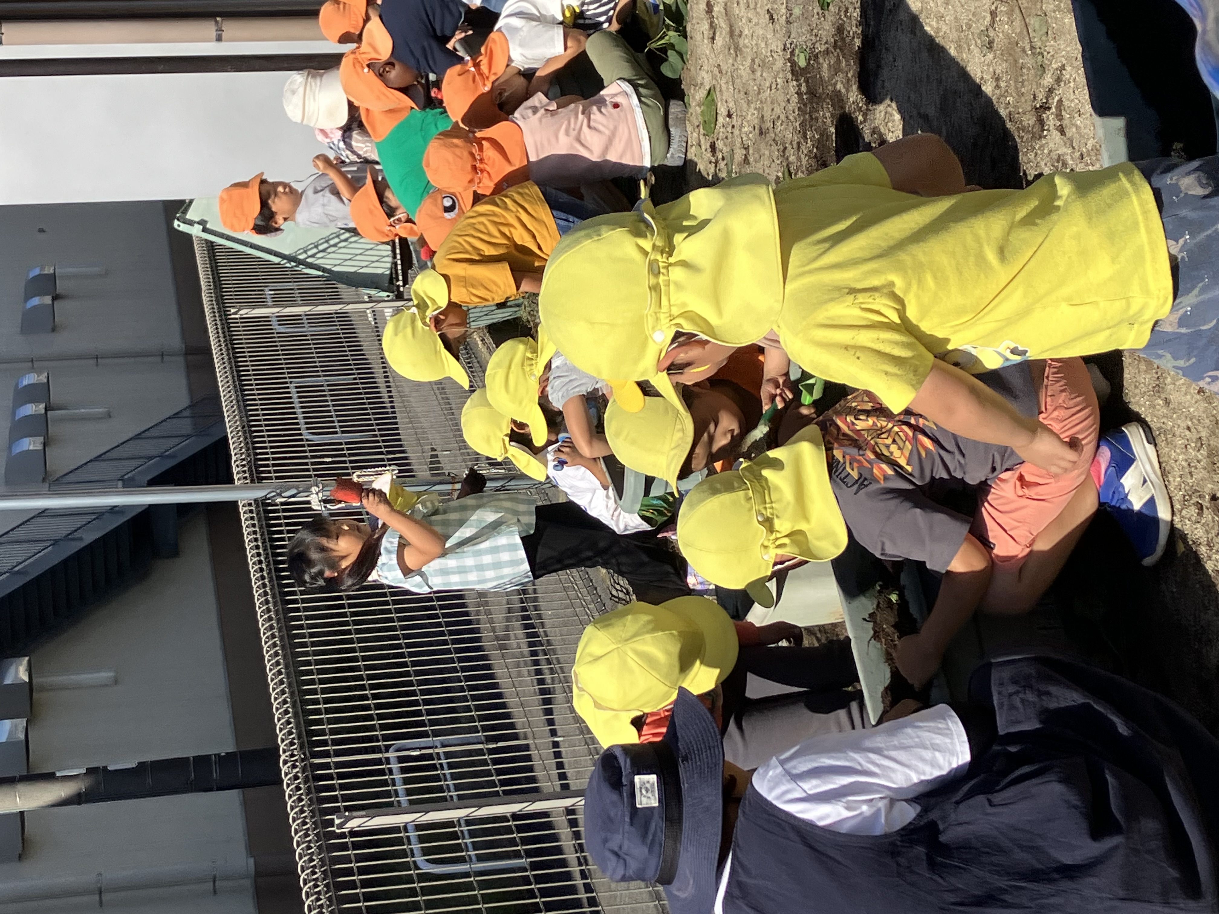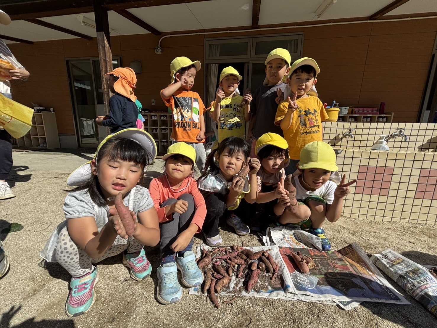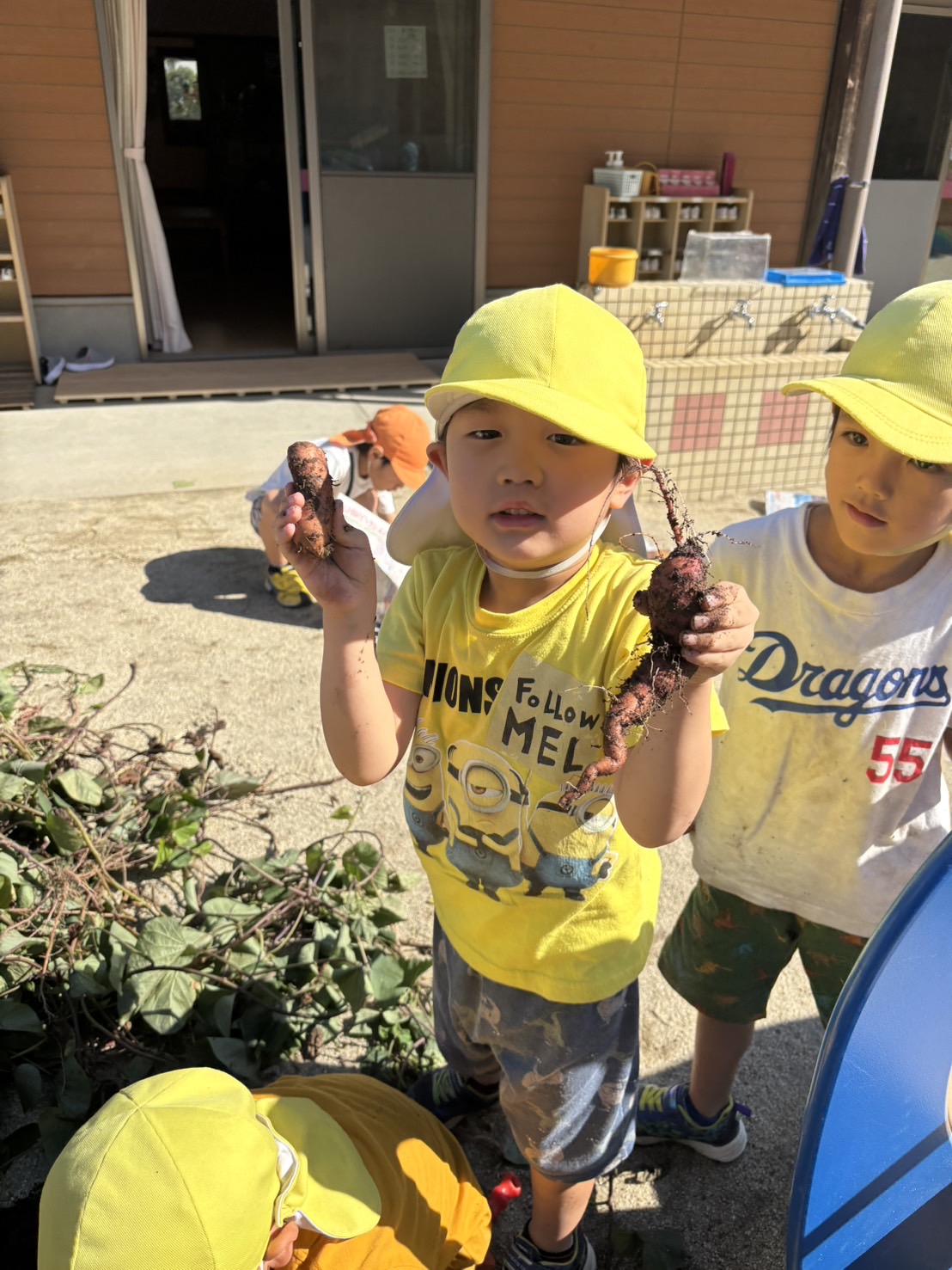 | 酷暑を乗り越えたサツマイモの苗は、ぐんぐん伸びて園庭を這っていましたが…掘ってみるとお芋は小さい、少ない・・の結果でした。 例年にない結果に地球温暖化を感じながら、残念な気持ちになった保育士。 しかし子供たちは芋ほりを楽しんでいました。 小さくてもお芋。 自分のお芋。 弦を引っ張る感触。 抜けた時の達成感。 そしておまけの謎の白い幼虫もゲットできました。 | ||