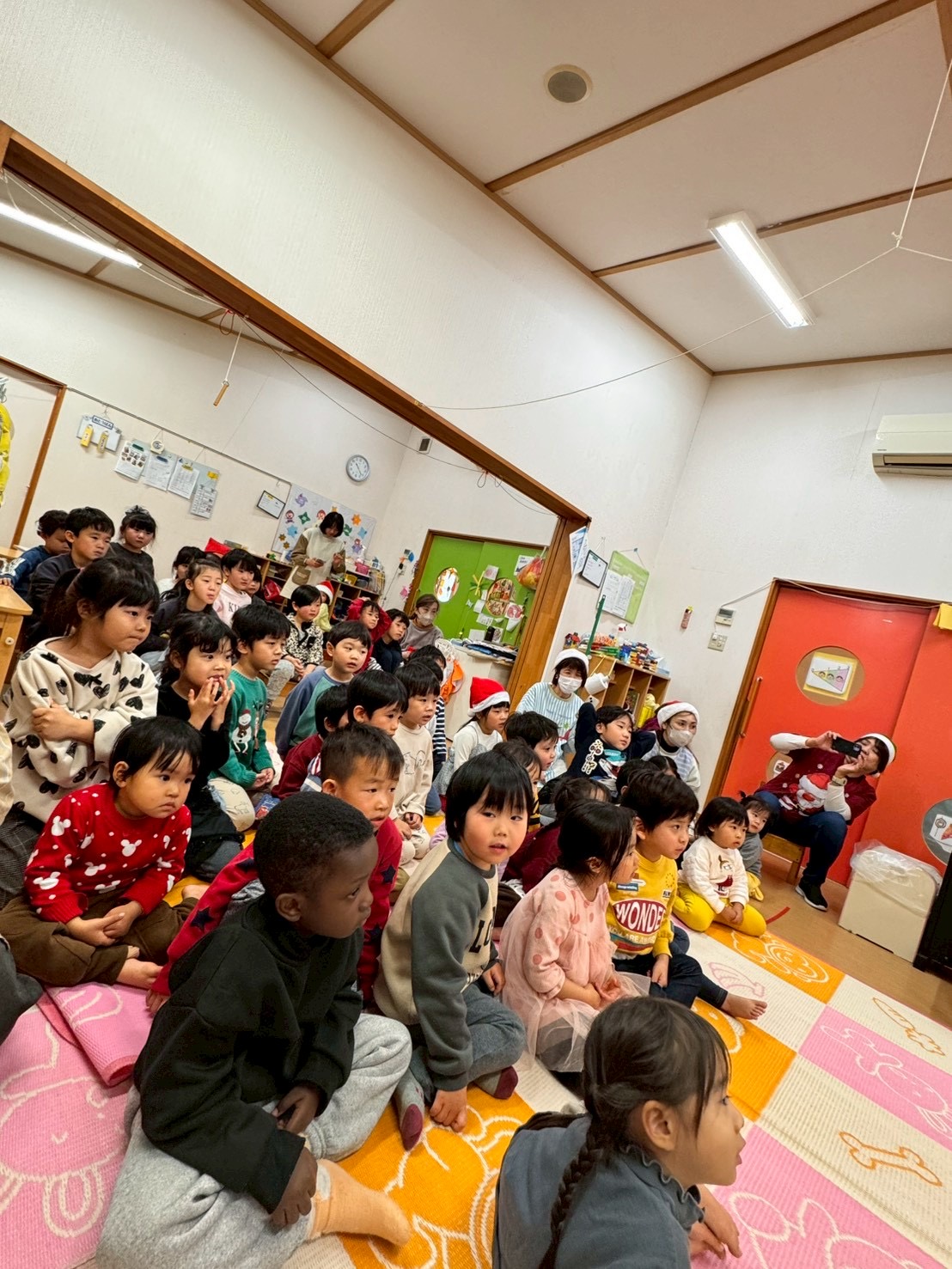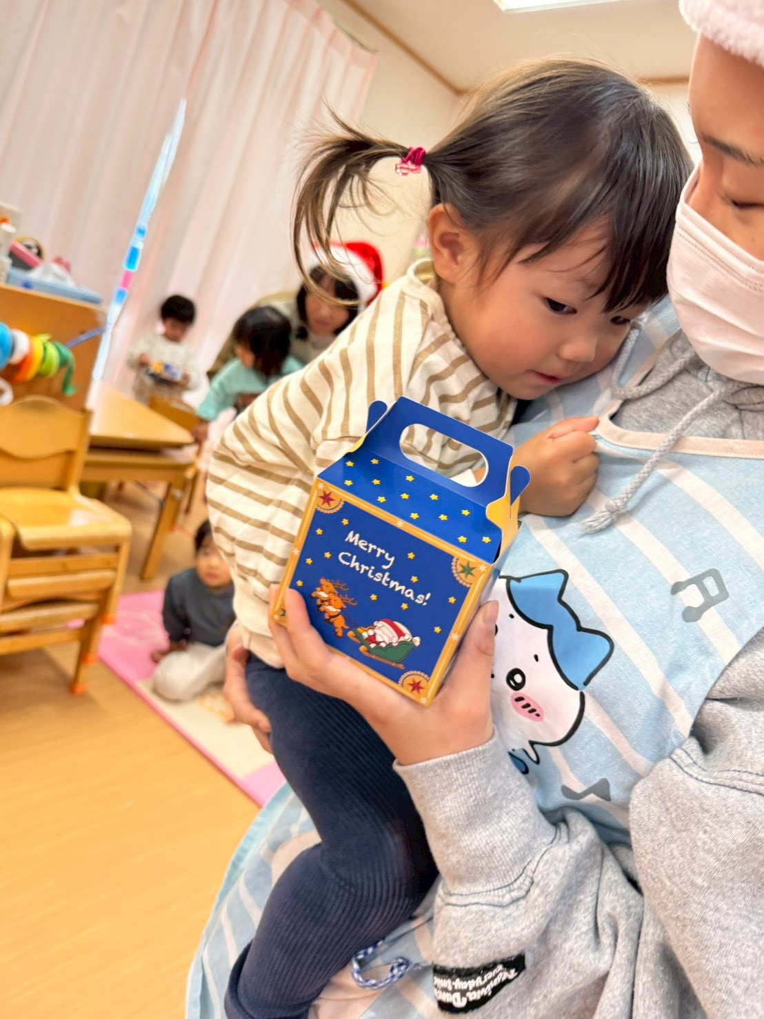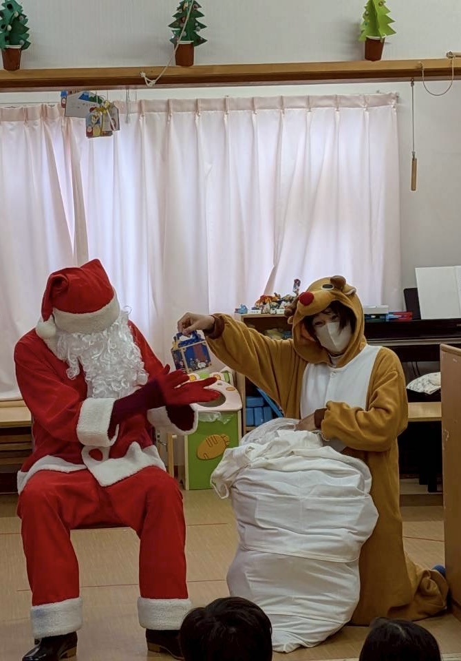 | 12月の誕生会に、な、なんとサンタがやってきました! トナカイさんに先導され、みんなにプレゼントを届けにきたとか。 子どもたちの「園長でしょお~~~???」の疑いの目を向けられながら、うつむき加減のサンタは帰っていきました。 恐ろしそうに警戒しながら それでもしっかりプレゼントを受け取る子供たち。 ・・・たくましいです。 |