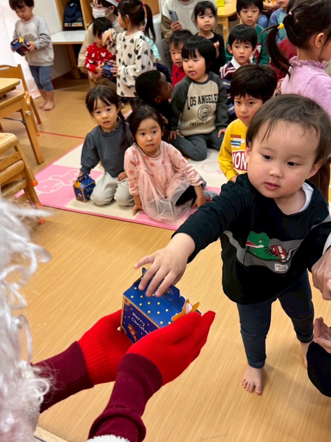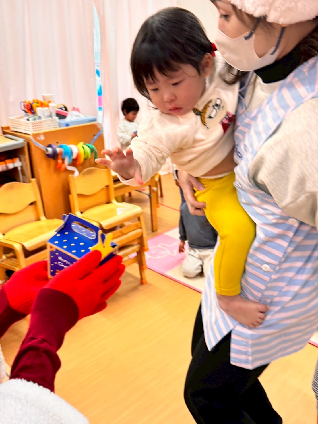 | 12月の誕生会に、な、なんとサンタがやってきました! トナカイさんに先導され、みんなにプレゼントを届けにきたとか。 子どもたちの「園長でしょお~~~???」の疑いの目を向けられながら、うつむき加減のサンタは帰っていきました。 恐ろしそうに警戒しながら それでもしっかりプレゼントを受け取る子供たち。 ・・・たくましいです。 |